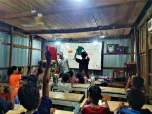 紙を折って絵を描く、変わり絵を皆んなで作りました。教材は現地に用意されていて、それを一緒に行いました。