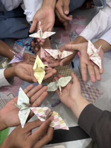 ここでは、折り紙や、50音表を用いて名前をひらがなで書く活動を行いました。現地の子たちはとても積極的で、活気を感じました。とても楽しくて、あっという間に時間が過ぎてしまいました。